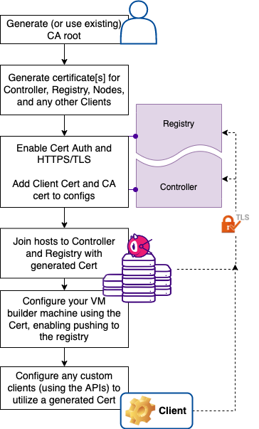 , enable TLS/HTTPS, and then enable certificate authentication. - With either the controller or registry standalone packages: You’ll edit the proper config files, enable TLS/HTTPS, and then enable certification authentication.