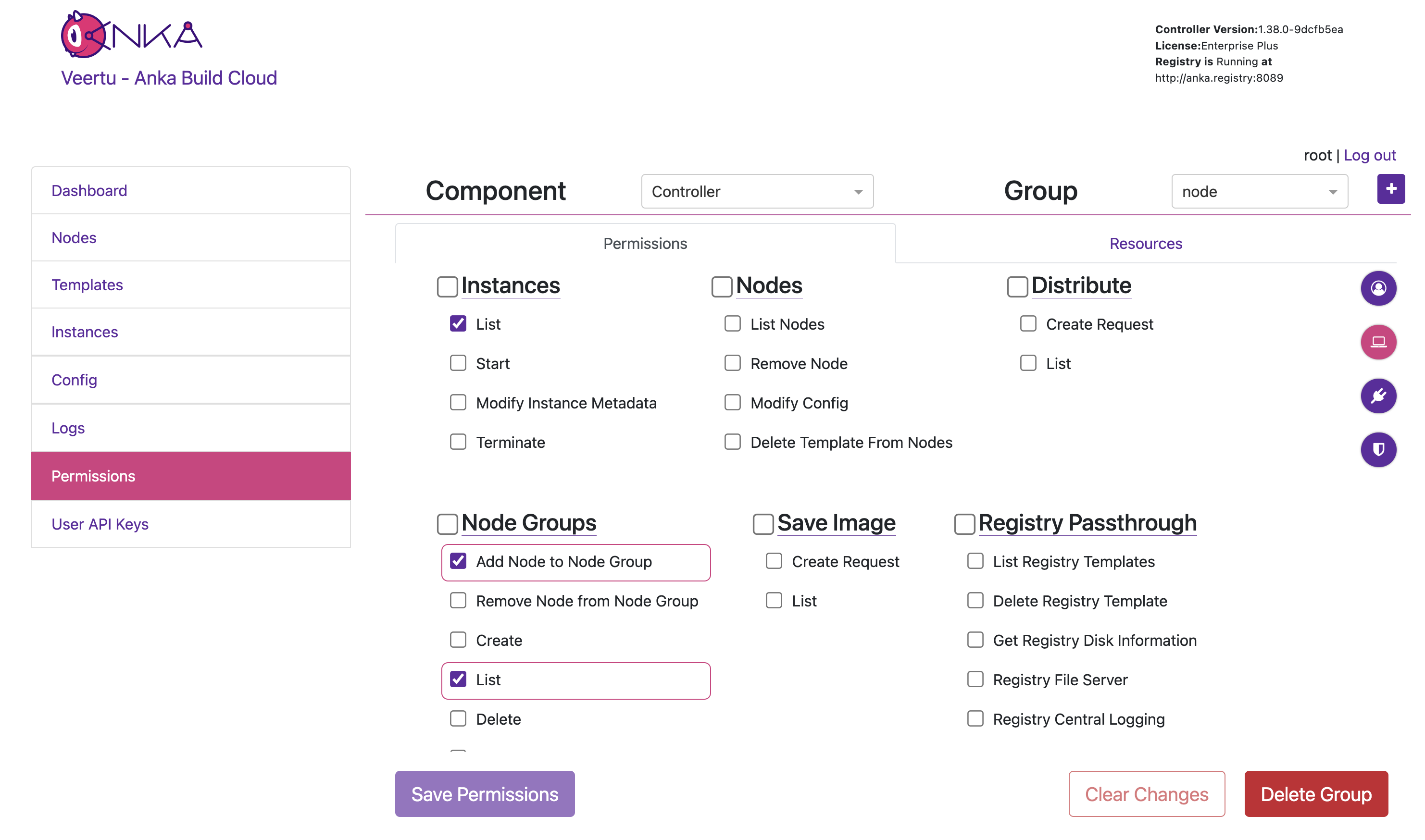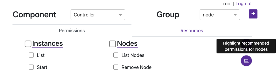 by clicking the [+] button.You can now target and add specific Permissions or Resources for the Group. Click the circular (💻) icon on the right to highlight what permission should be set for Nodes to communicate with the Controller. Then check/enable the highlighted permissions and click Save Permissions at the bottom of the page. Important: Finally, do the same but under the Registry Component.